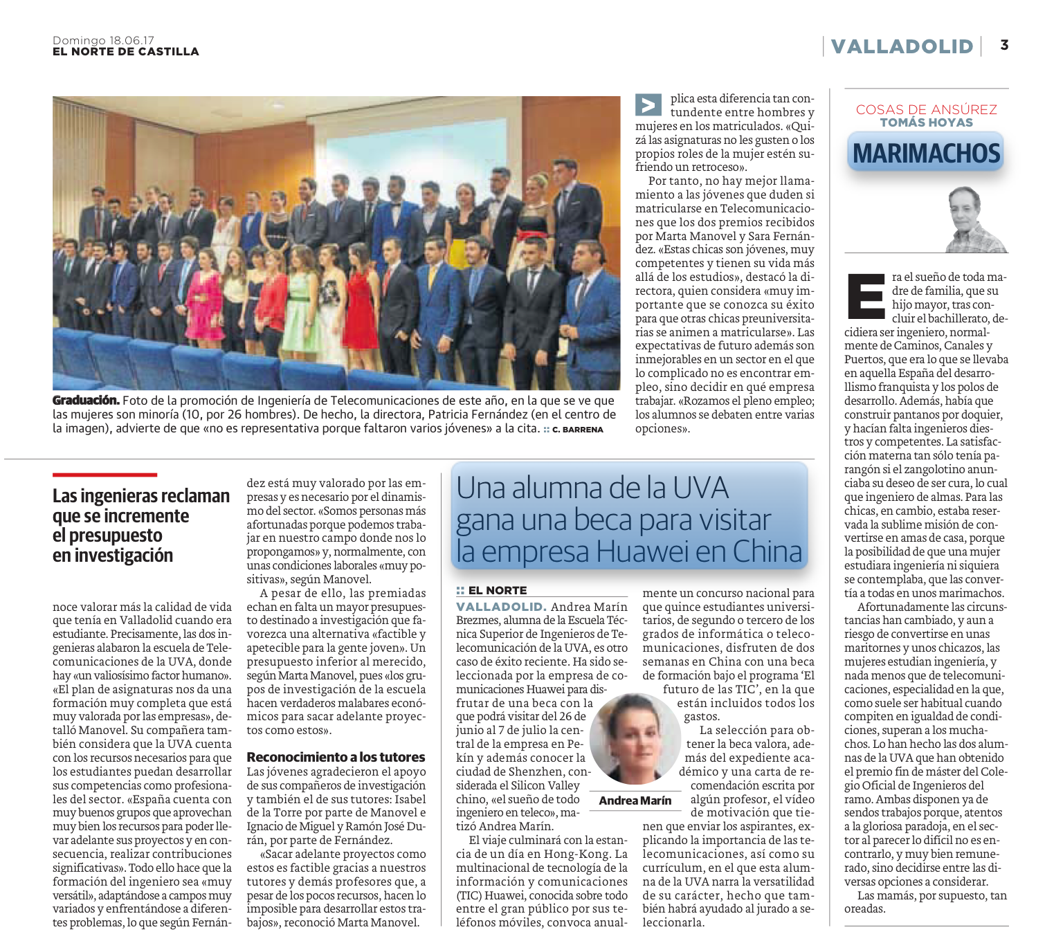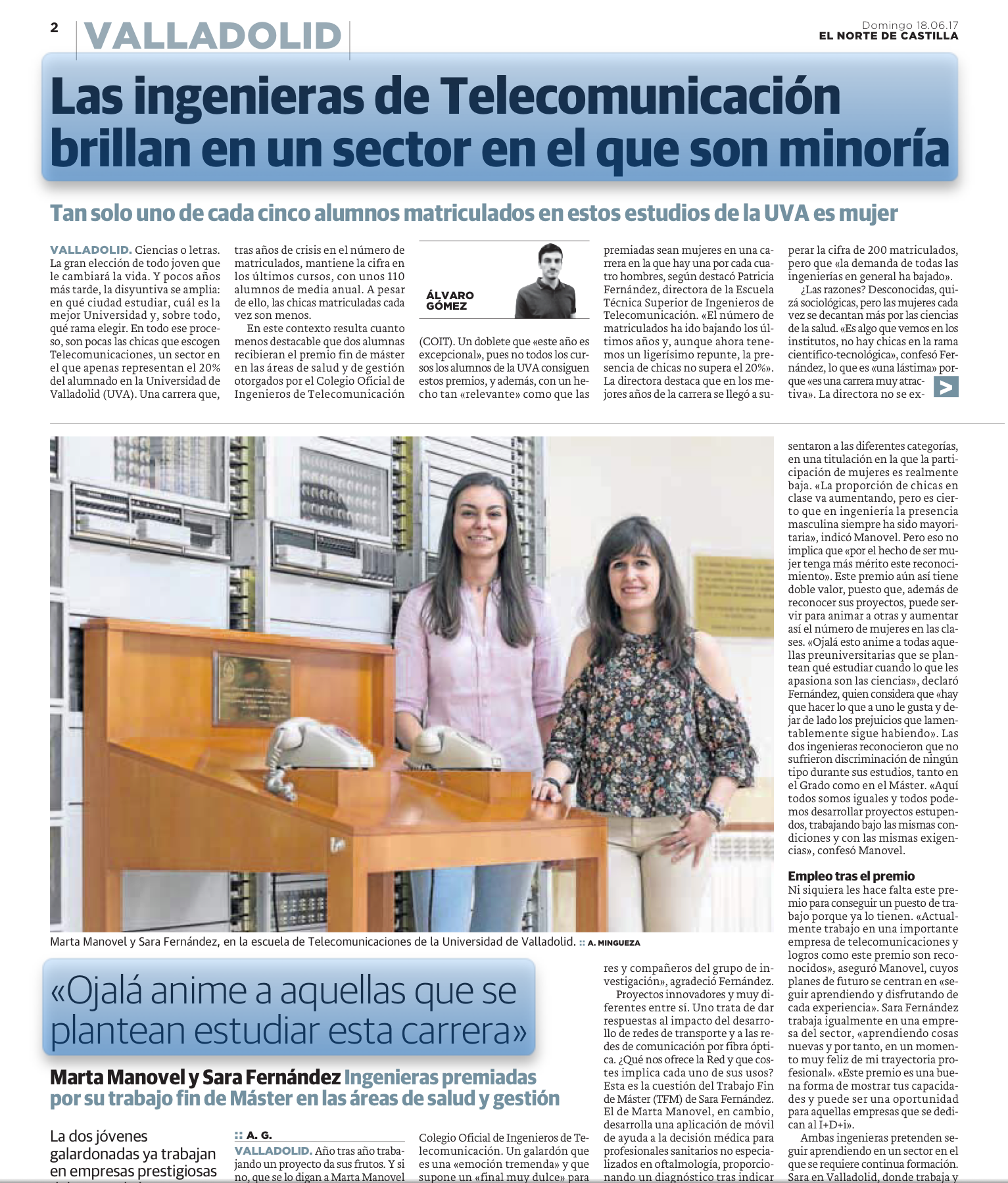 La directora de la Escuela Técnica Superior de Ingenieros de Telecomunicación de la Universidad de Valladolid, Patricia Fernández del Reguero, destaca que "estudiar 'teleco' es una excelente opción de futuro sin distinción de género. Como ejemplo, los competidísimos premios que han obtenido dos brillantes tituladas del Máster Ingeniero de Telecomunicación".