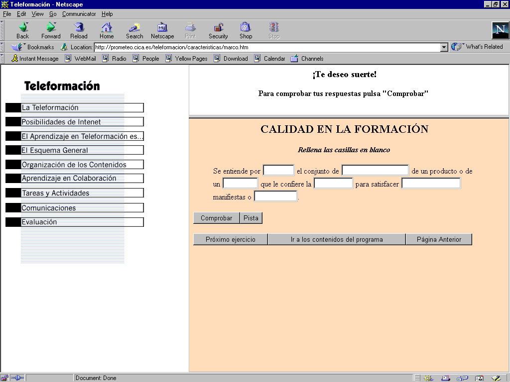 Está programado para funcionar con Internet Explorer 5.0 o Superior, es decir que si utilizamos el Netscape probablemente no podamos visualizar correctamente todos los contenidos. Inicialmente estos cursos serán completamente on-line.